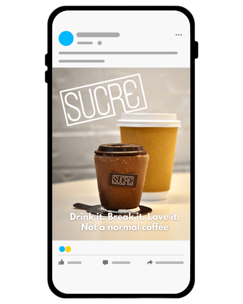 A bold comparison post contrasting a standard disposable coffee cup with Sucre’s edible chocolate coffee creation. Designed to spark curiosity and emphasize product differentiation, the visual reinforces the campaign message “Not a Normal Coffee” while highlighting innovation and experiential value.